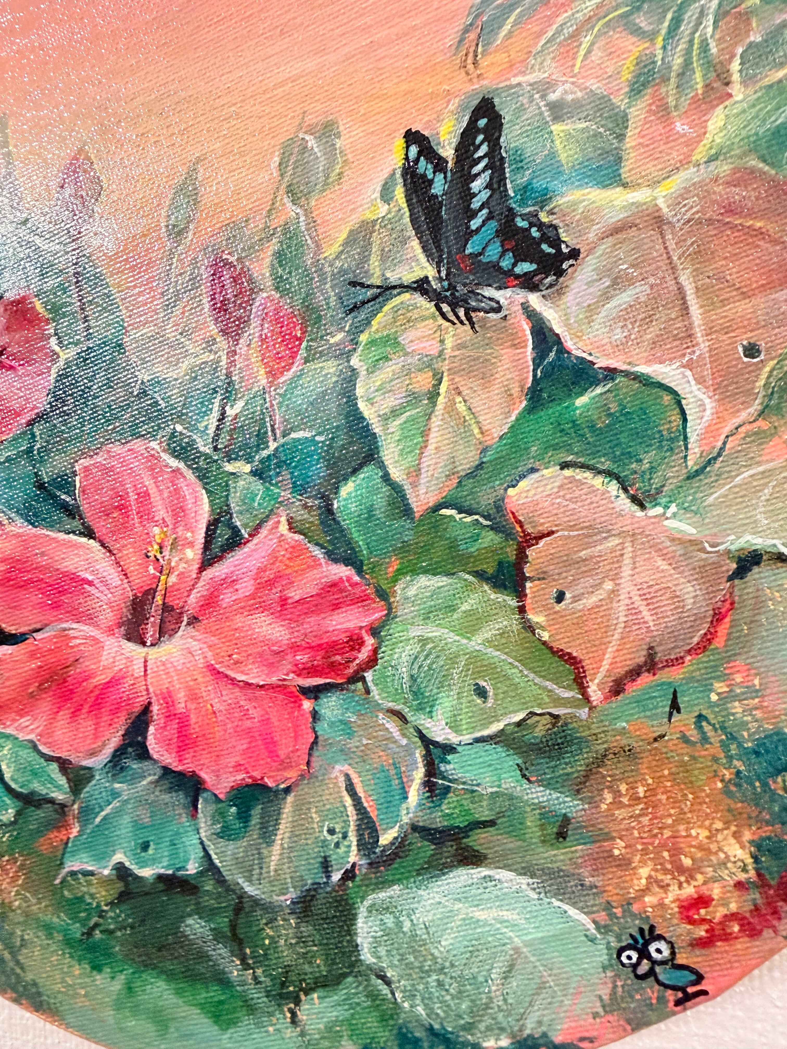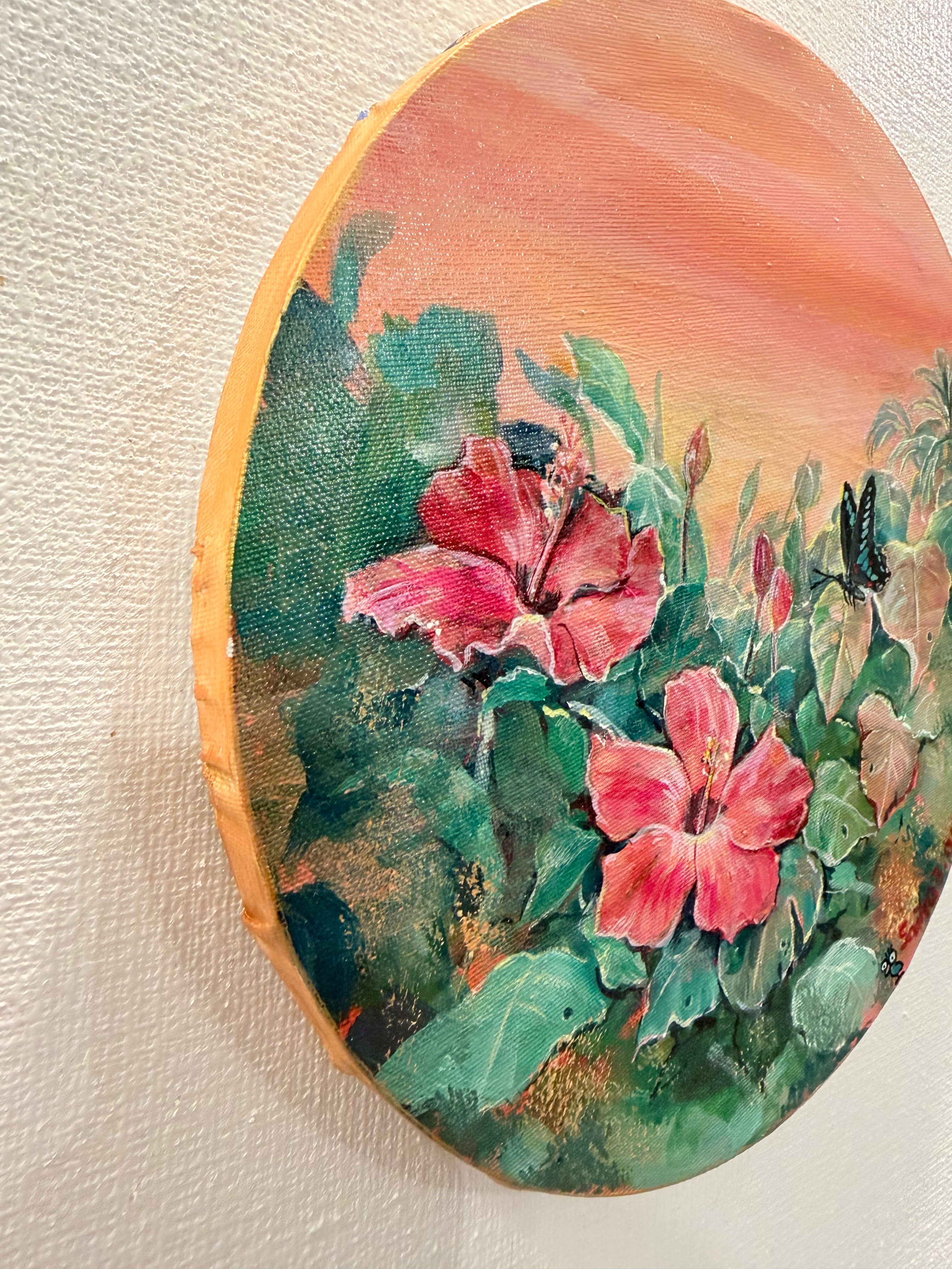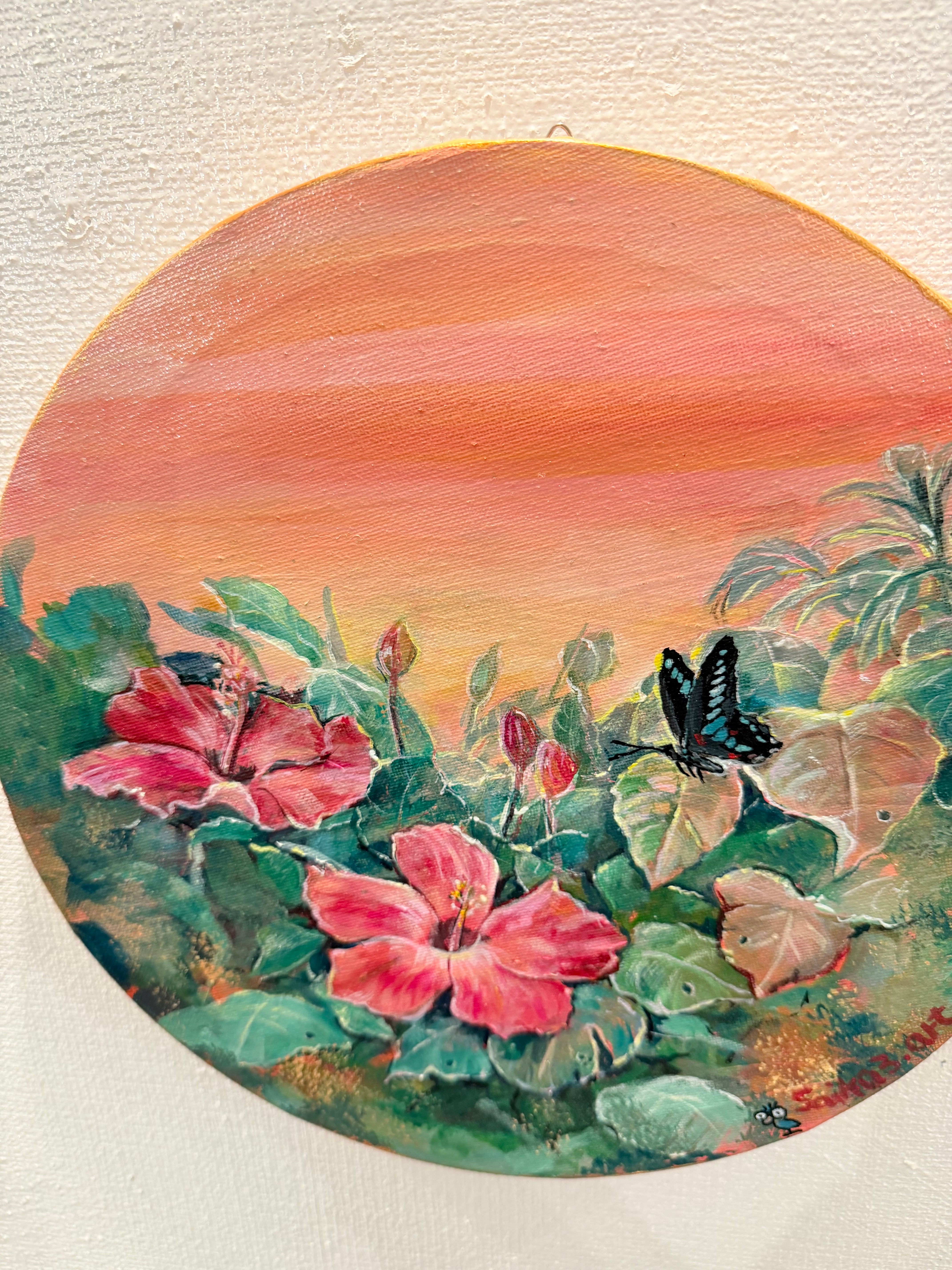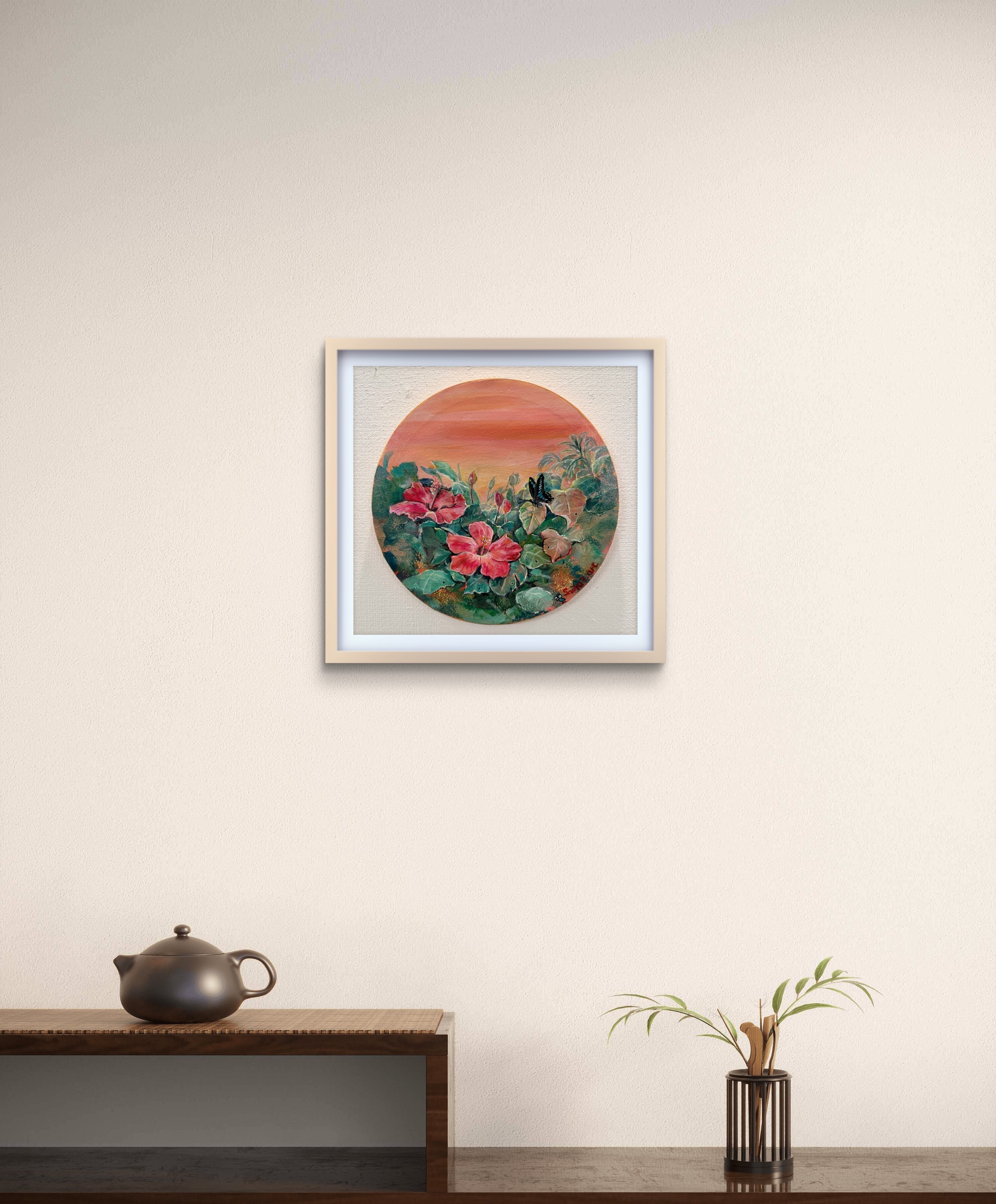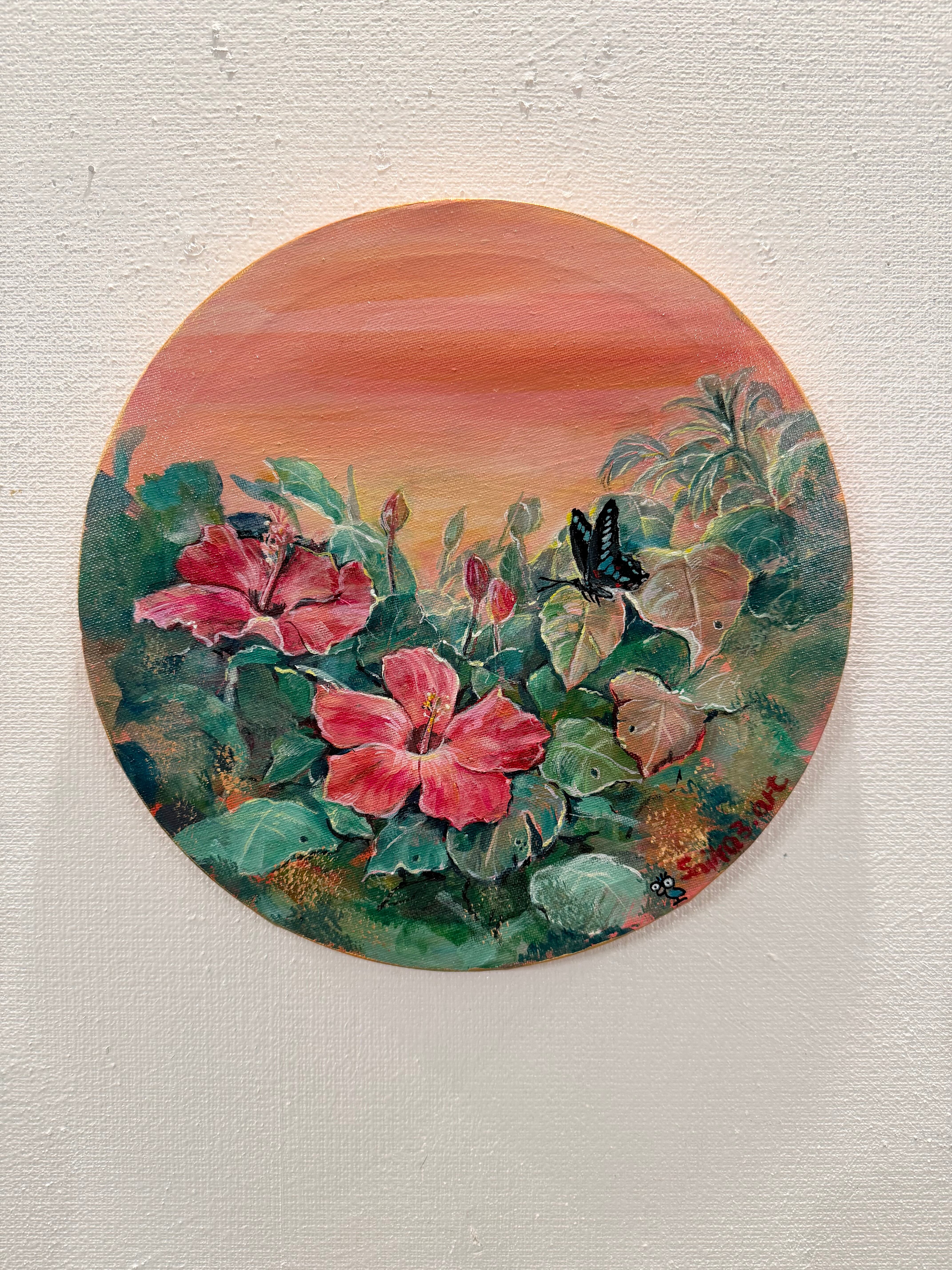 夕暮れの光に包まれたハイビスカスと蝶。